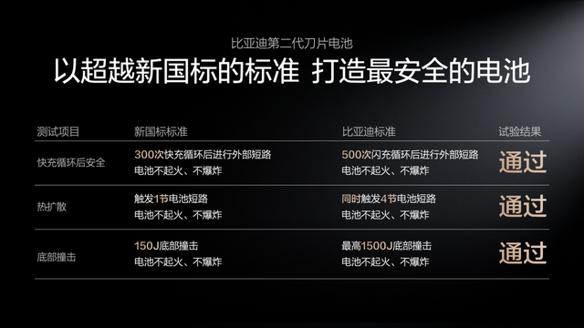 此外,在热扩散测试中,比亚迪主动触发4节电池短路(新国标仅要求触发1节),周围电芯温度仍保持稳定;在底部撞击测试中,在新国标的标准基础上,成功挑战10倍新国标撞击能量的底部撞击试验,电池不起火、不爆炸。这一系列测试,都在反复验证一个结论:第二代刀片电池在快充模式下,安全性不打折扣。