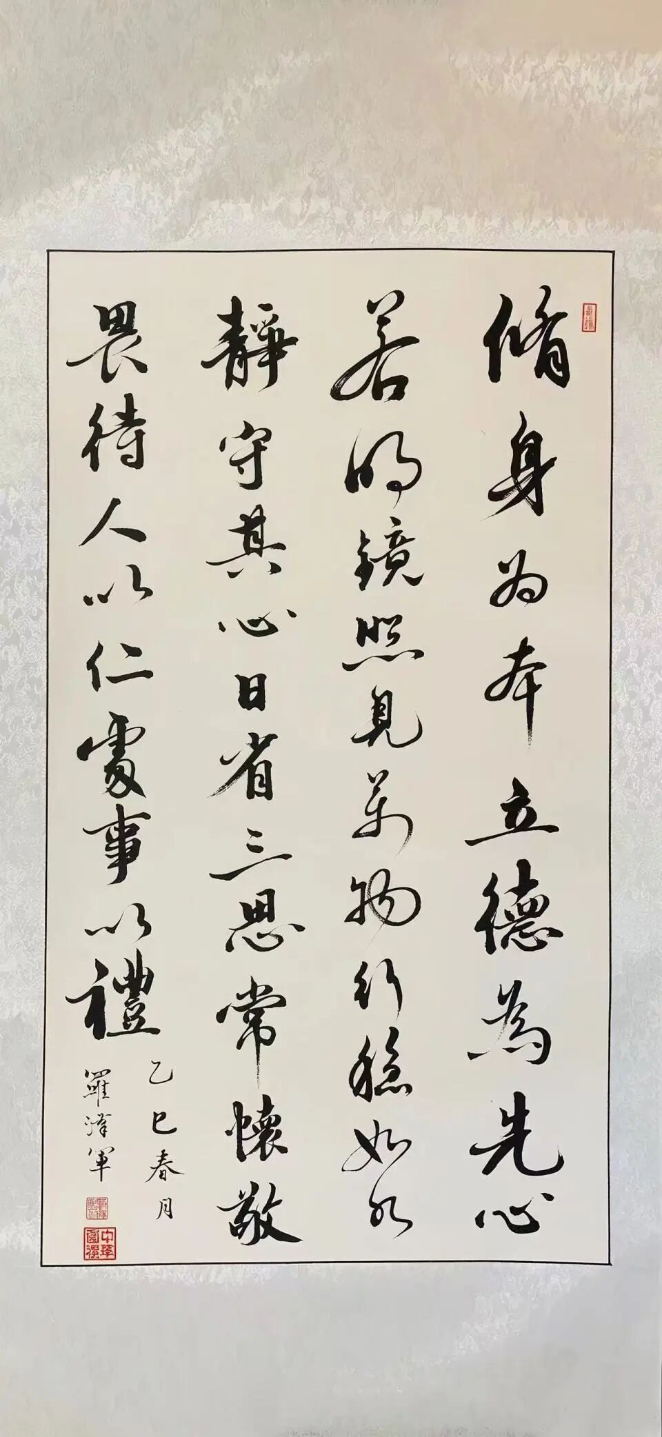 艺术的道路永无止境,路漫漫其修远兮,吾将上下而求索,罗汉军将不忘初心、牢记使命、坚持“六个坚持”和“两个结合”结合自身实际工作,砥砺奋进、我将无我、传承创新践行传播中华优秀传统文化,以书法作品为载体坚持以文化人、以文惠民、以文润城、以文兴业,在推动文化传承发展上善作善成,进而为铸建人类命运共同体伟大工程添砖加瓦,弘道坚毅而行。