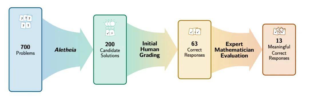 作者团队在 2025 年 12 月 2–9 日部署了一个基于 Gemini Deep Think 的定制数学研究智能体 Aletheia,对 Bloom 数据库中当时仍标注为「Open」的约 700 个 Erdős 问题进行半自动探索。Aletheia 内置自然语言验证器(verifier),用于在大规模生成后先做第一轮筛选,将候选问题从 700 个快速收敛到 212 个「看起来可能正确」的回答。