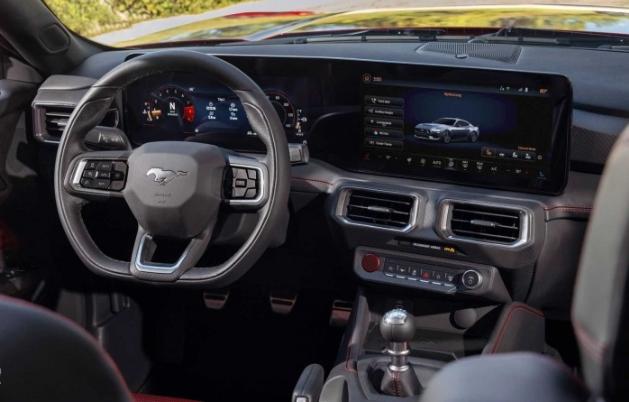 进入到车内,全新一代福特Mustang采用了时下流行的一体式液晶屏幕设计,其中液晶显示屏为12.4英寸,中控液晶显示屏为13.2英寸,同时配备三辐式多功能方向盘以及偏向驾驶位的中控台设计,进一步提升了新车的科技感;除此之外,新车的中控台下方还保留了实体按键和机械档杆等配置;值得一提的是,虽然手刹拉杆看似为传统机械钢索结构,但是实质上已经调整为电子设计。