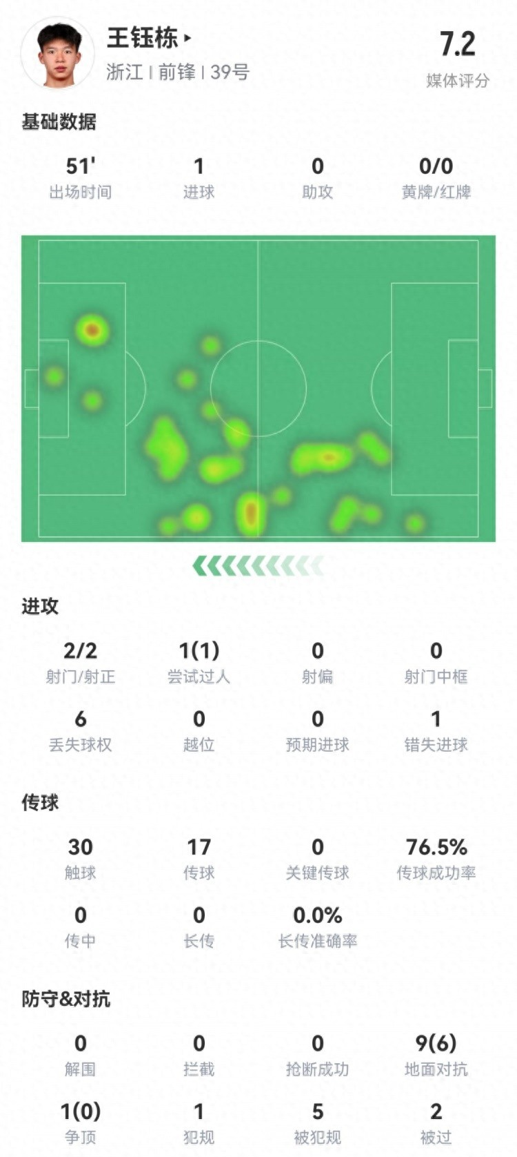 面对实力强劲的武汉三镇,浙江队取得了4-0的大比分领先。替补登场本该是稳妥之举,然而,主教练却给了王钰栋首发的机会,这份信任是多么的珍贵!更令人惊讶的是,王钰栋没有辜负期望。他在比赛中展现出了惊人的爆发力,攻入个人中超处子球,并制造了一个乌龙球,这对于一位18岁的新秀来说,是何等的荣耀! 你很难想象,一个刚踏上职业赛场的孩子,能如此淡定冷静地面对比赛的压力,在关键时刻把握住机会。他不仅展现了良好的射门能力,2次射门全部命中目标,也展现了过人的胆识和自信。数据显示,他完成了一次过人,传球成功率达到76.5%,对抗成功率也达到了60%。 这真是一个难能可贵的开局!