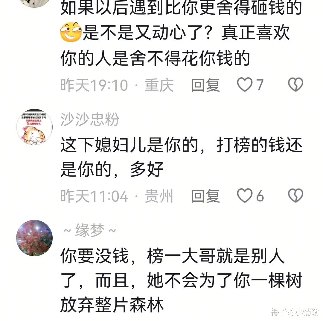 看到男子分享的和女神约会的视频后,有人祝福,有人唏嘘,觉得这样建立在金钱之上的关系不够纯粹,如果哪一天男子无法成为榜一大哥,或者有新的大哥出现之后他的地位立马保不住了。