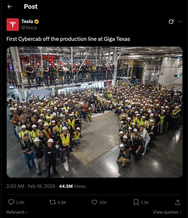 2月18日,特斯拉在X上宣布:第一台Cybercab量产车,已在德州超级工厂正式下线。 由于时间点恰逢中国农历大年初二,且特斯拉并未对这一消息进行大规模宣发,这个节点在国内并没有激起太多水花。