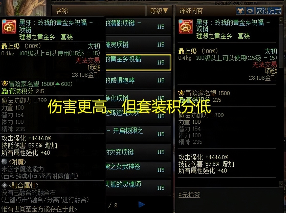 升级后的“黑牙装备”比同品级套装大概高了2%左右,但同时套装积分少了50点!