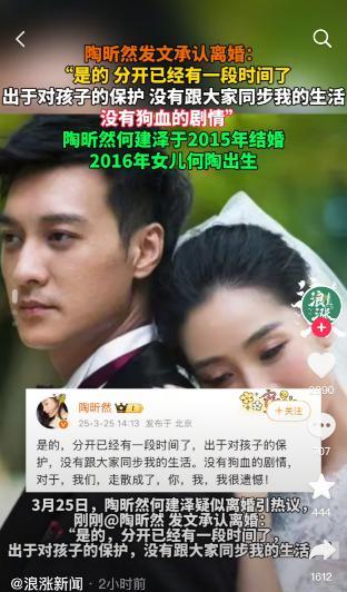 3月25日,演员陶昕然一纸声明,宣告了与丈夫何建泽的婚姻走到尽头。