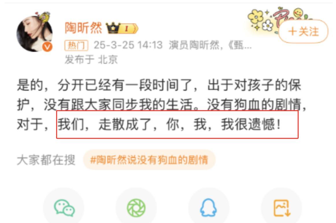 陶昕然在声明中表示,双方和平分手,没有狗血剧情,但言语间难掩遗憾。