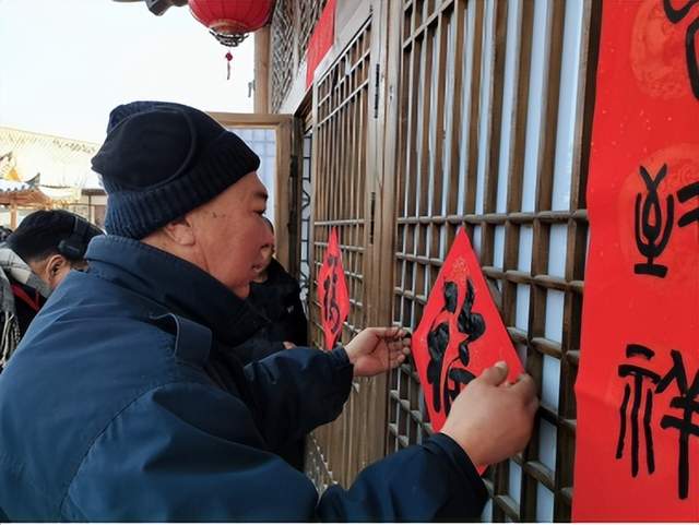 古色古香的“宫廷”布景内,来自县文联的书法家挥毫泼墨,浓浓的年味伴随着墨香四溢。一副副寓意吉祥的春联和一个个遒劲有力的“福”字,吸引了现场的民警、返乡大学生、社区志愿者及游客们驻足观赏。大家将承载着新年期盼的春联,小心翼翼地贴上古城的门窗。这不仅是一次民俗体验,更是一场全民参与、共迎新春的文化互动。