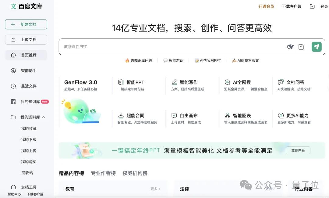 百度文库基于海量文档数据积累,从文档工具向知识生产力平台转型。支持智能写作、文档问答、PPT生成等全流程办公场景,在教育、法律等专业领域建立起内容壁垒。将“工具”升级为“平台”,让AI真正赋能知识工作流。