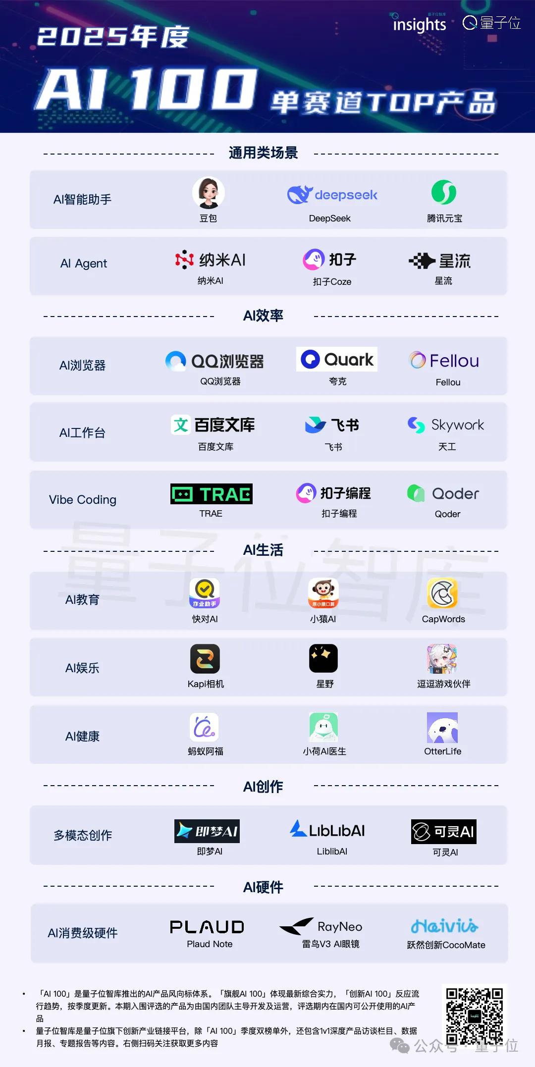 为全面归纳本年度AI产品的发展脉络与成绩,量子位智库现正式发布2025年度中国AI 100产品榜单。