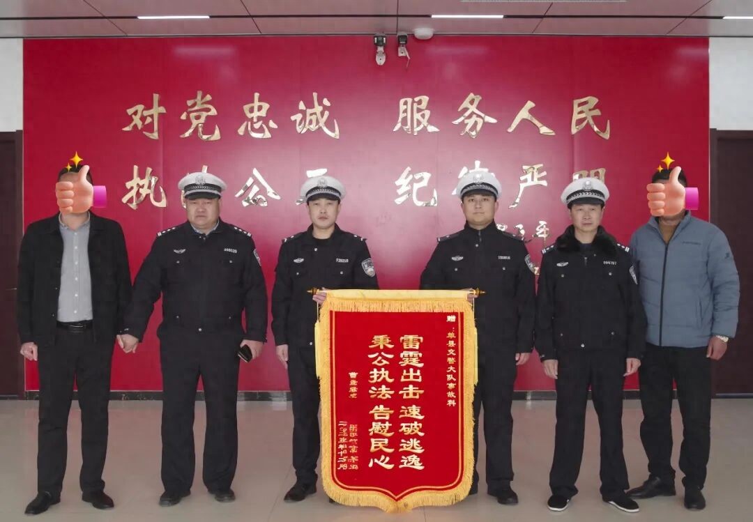 12月17 日上午,单县曹庄镇村民将一面印有 “雷霆出击速破逃逸 秉公执法告慰民心” 的锦旗,送到单县公安局交管大队事故处理中队,以此致谢民警快速侦破肇事逃逸案。