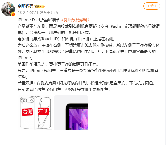 2026年2月2日,博主“刹那数码”爆料称,苹果iPhone Fold折叠屏手机音量键不在左侧,而是直接放到右侧机身顶部。