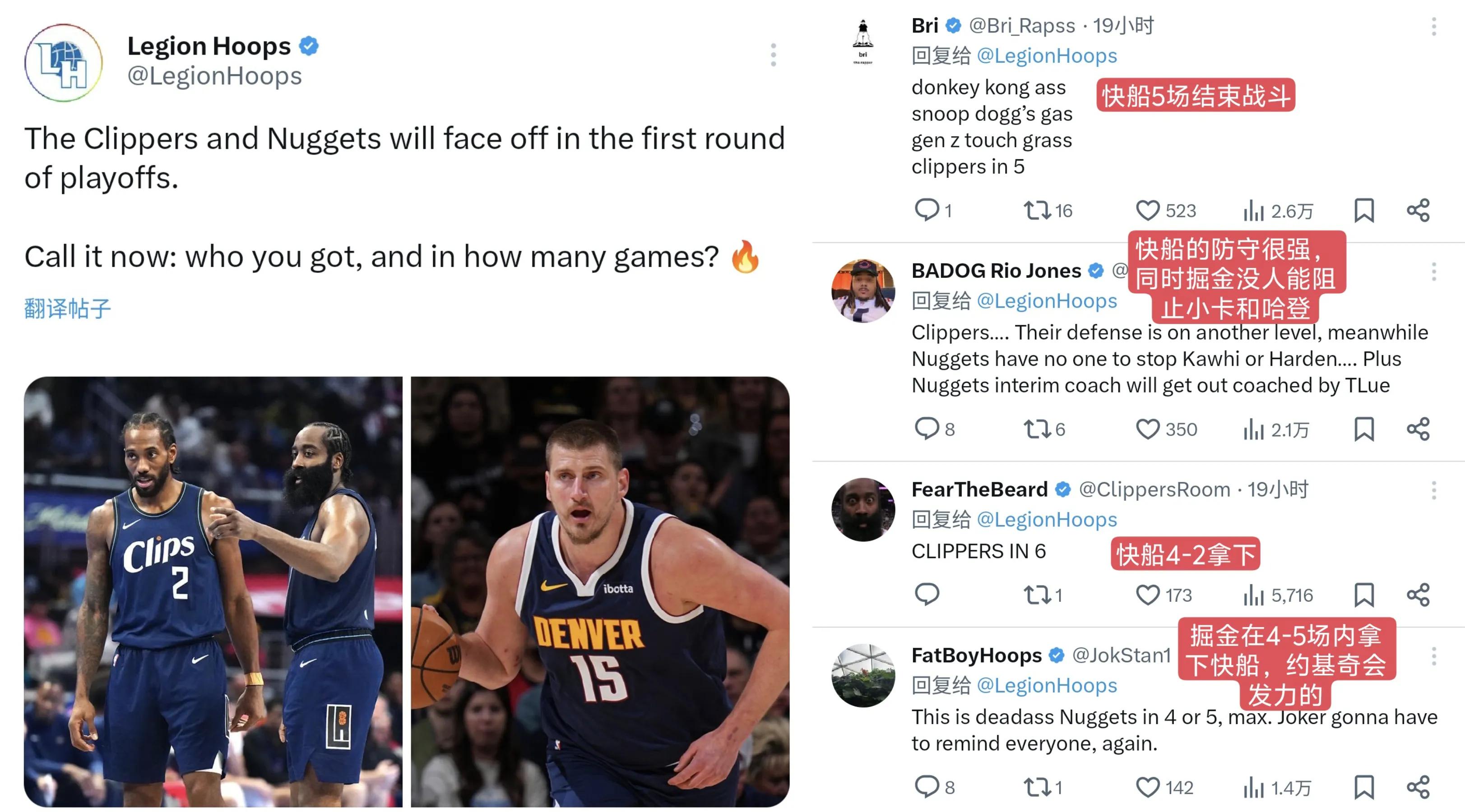 为此美媒也发问:“你认为谁会赢,又需要几场比赛?”不少网友在底下评论,有说掘金4-5场拿下的,有说快船5-6场拿下的。而篮球评论员管维佳说,“掘金攻守失衡,快船有机会4-2拿下掘金。”