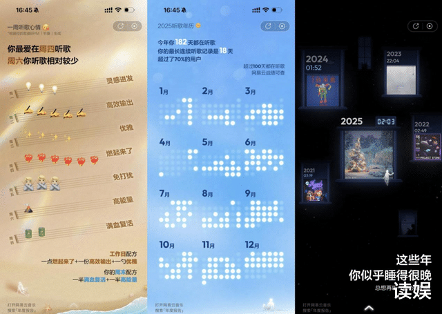 同时,2025年度听歌报告展现了更为细腻的听歌数据,用户可通过每周听歌心情、2025听歌年历、5年深夜听歌时间对比、最爱听歌时段、听歌城市等维度,回顾自己在不同时刻的听歌情绪与状态。“年度歌手来信”玩法也持续升级,新增更多音乐人来信,同时还有专属语音、音乐人手绘图等限定惊喜。
