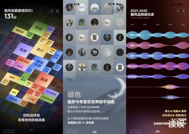 在体现用户听歌偏好的盘点类别,除年度曲风top5外,曲风制霸回归,并新增音乐颜色、曲风进化史、听歌语种、新发行歌曲收听数等数据,清晰展现用户在音乐风格上的探索。