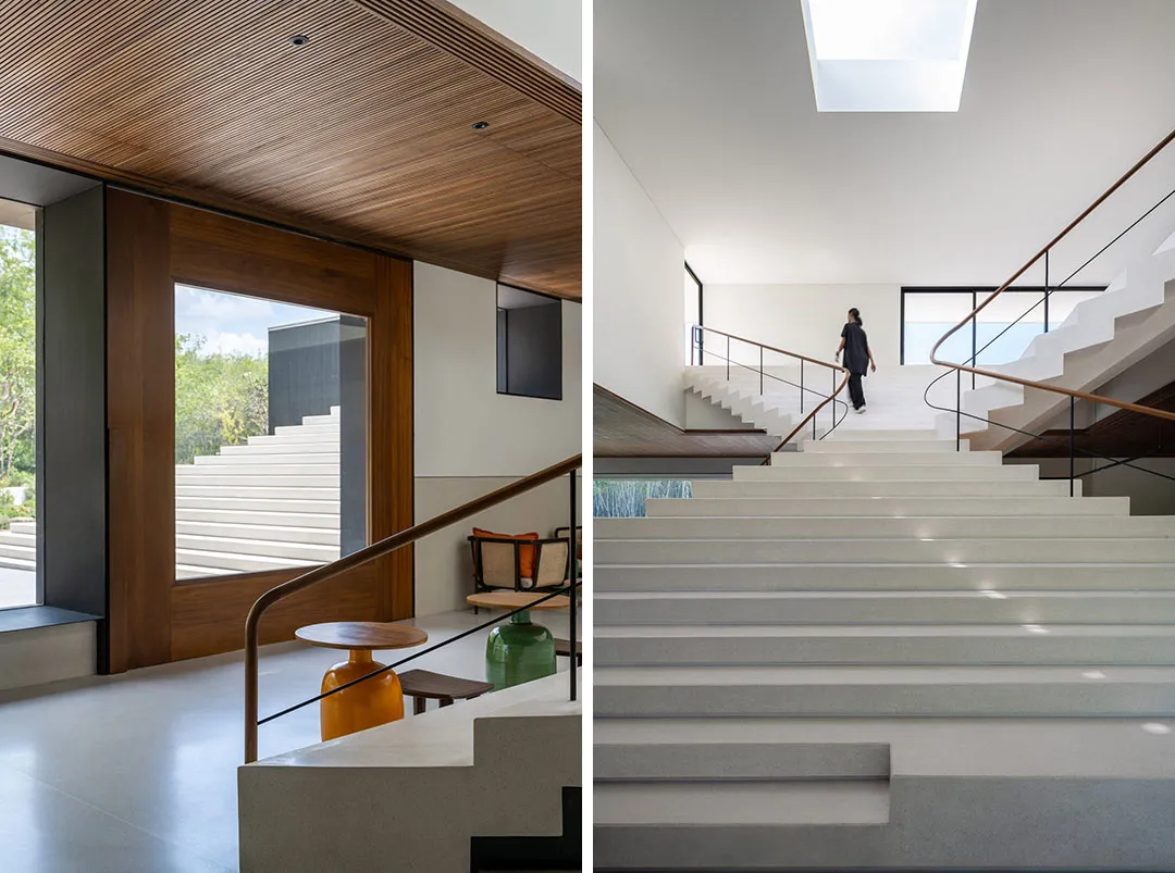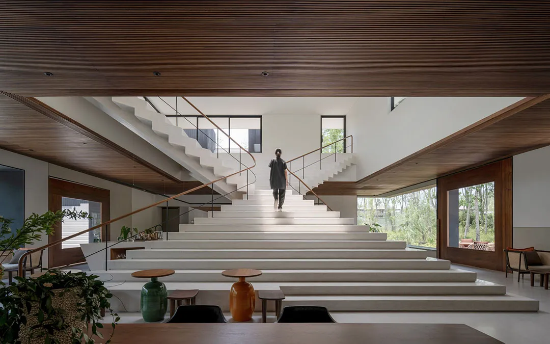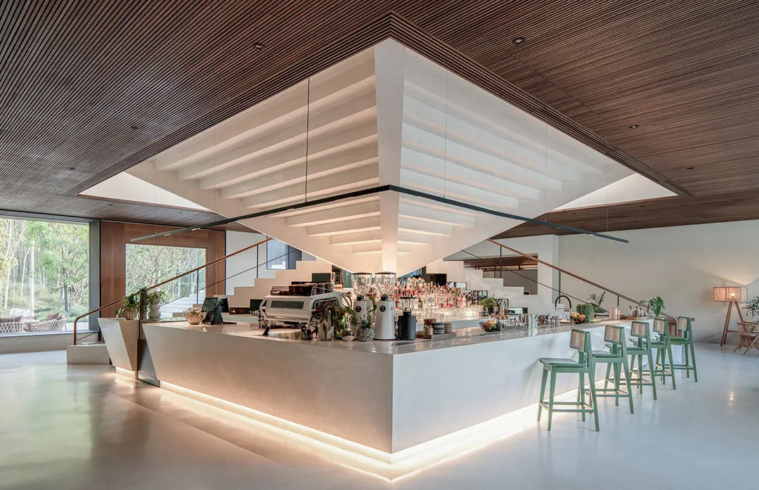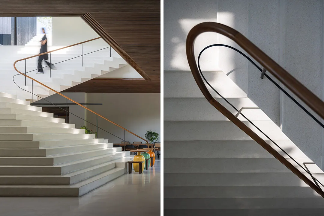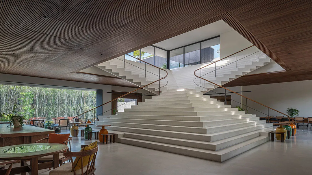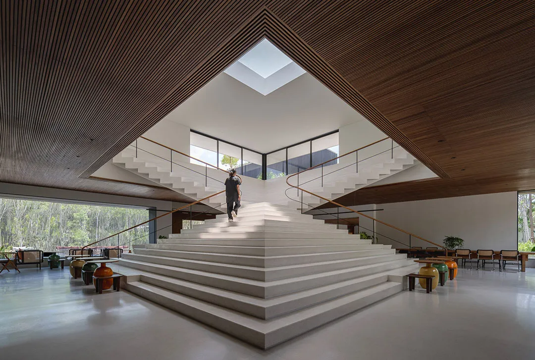 ▲ 楼梯后隐藏设计了一个开放式酒吧在公共中心内部的中心区块,建筑师设计了一个雕塑般的金字塔形楼梯,并由高位窗户和天窗照亮,不仅衔接着外部建筑形态,而且可以观赏屋顶上的绿植。楼梯后面隐藏设计了一个酒吧,看起来就像被阶梯形态反向包裹,酒吧两侧分别设有一个小画廊空间和休闲座位区。