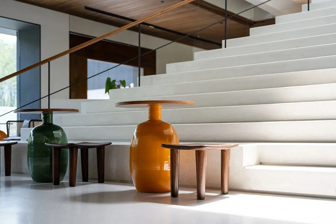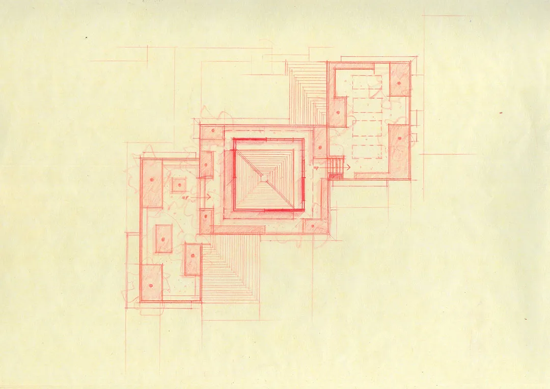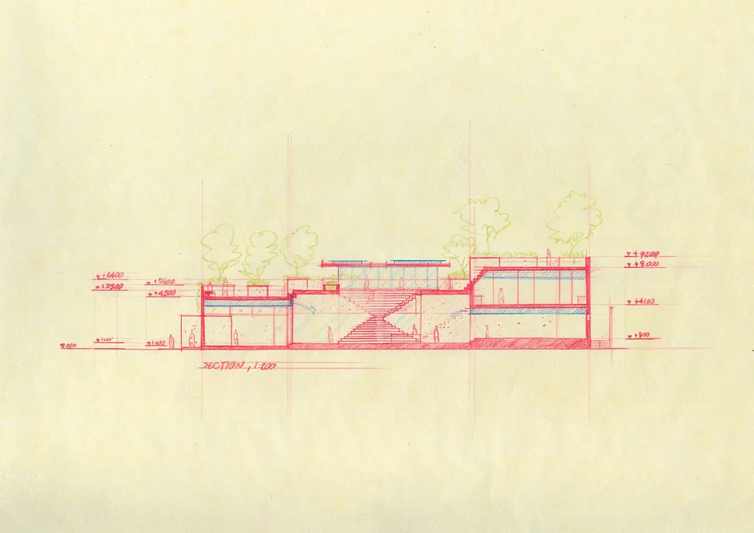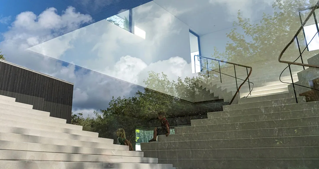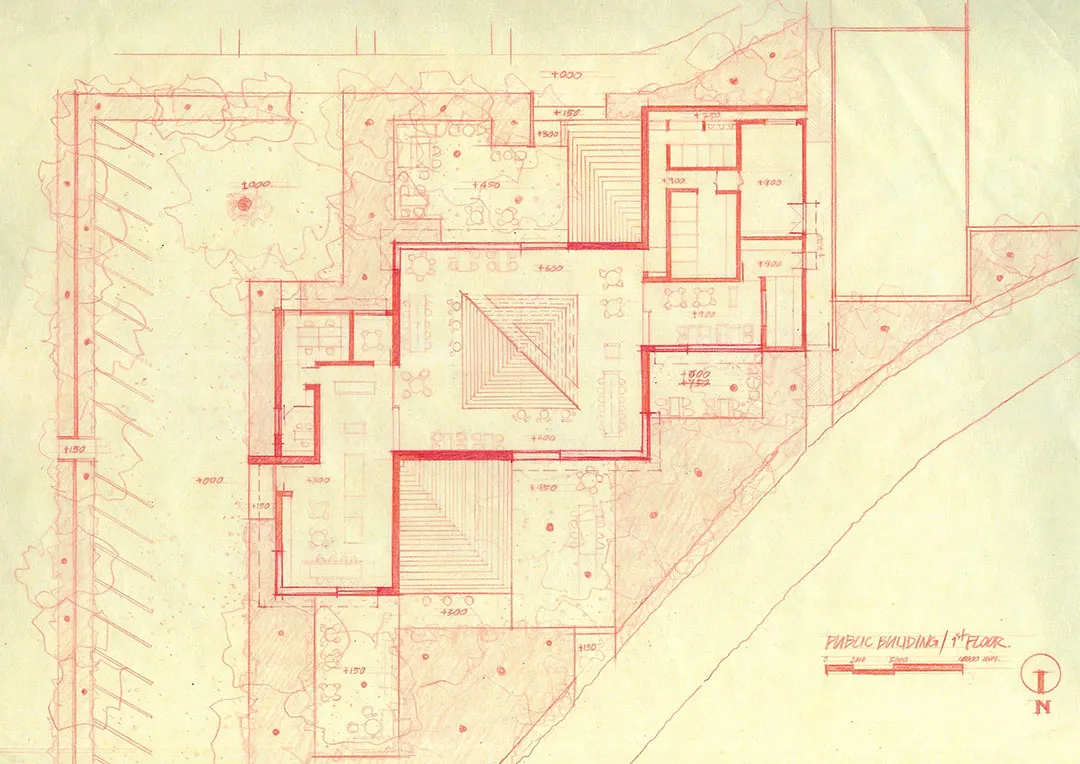 ▲ 楼梯后隐藏设计了一个开放式酒吧在公共中心内部的中心区块,建筑师设计了一个雕塑般的金字塔形楼梯,并由高位窗户和天窗照亮,不仅衔接着外部建筑形态,而且可以观赏屋顶上的绿植。楼梯后面隐藏设计了一个酒吧,看起来就像被阶梯形态反向包裹,酒吧两侧分别设有一个小画廊空间和休闲座位区。