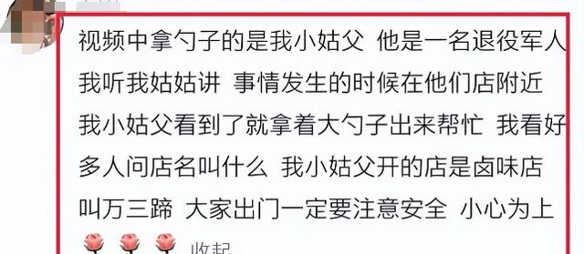 评论区一位称自己是“勺子哥”侄子的网友表示,见义勇为的“勺子哥”是一名退伍军人,因为事发地点在他姑父店附近,他看见了危险就拎着勺子出来帮忙了。