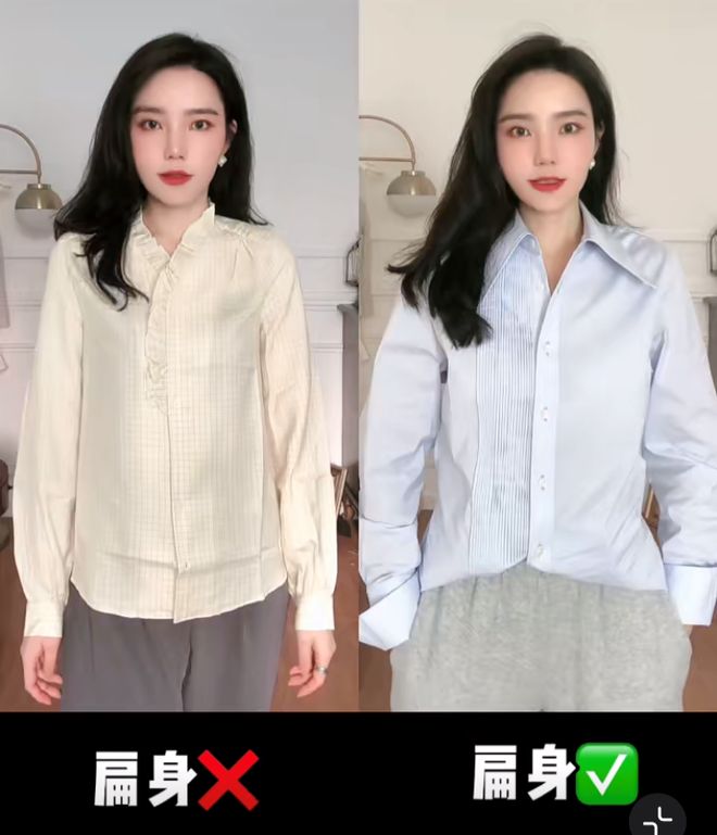 纸片人身材的姐妹千万不要选择修身、轻薄的衬衫,上身身材优势瞬失,还会显low、显土。