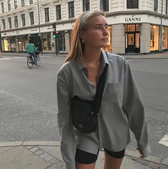 可以选择丝质面料或是oversized版型的衬衫修饰身型,达到视觉上显瘦的效果。
