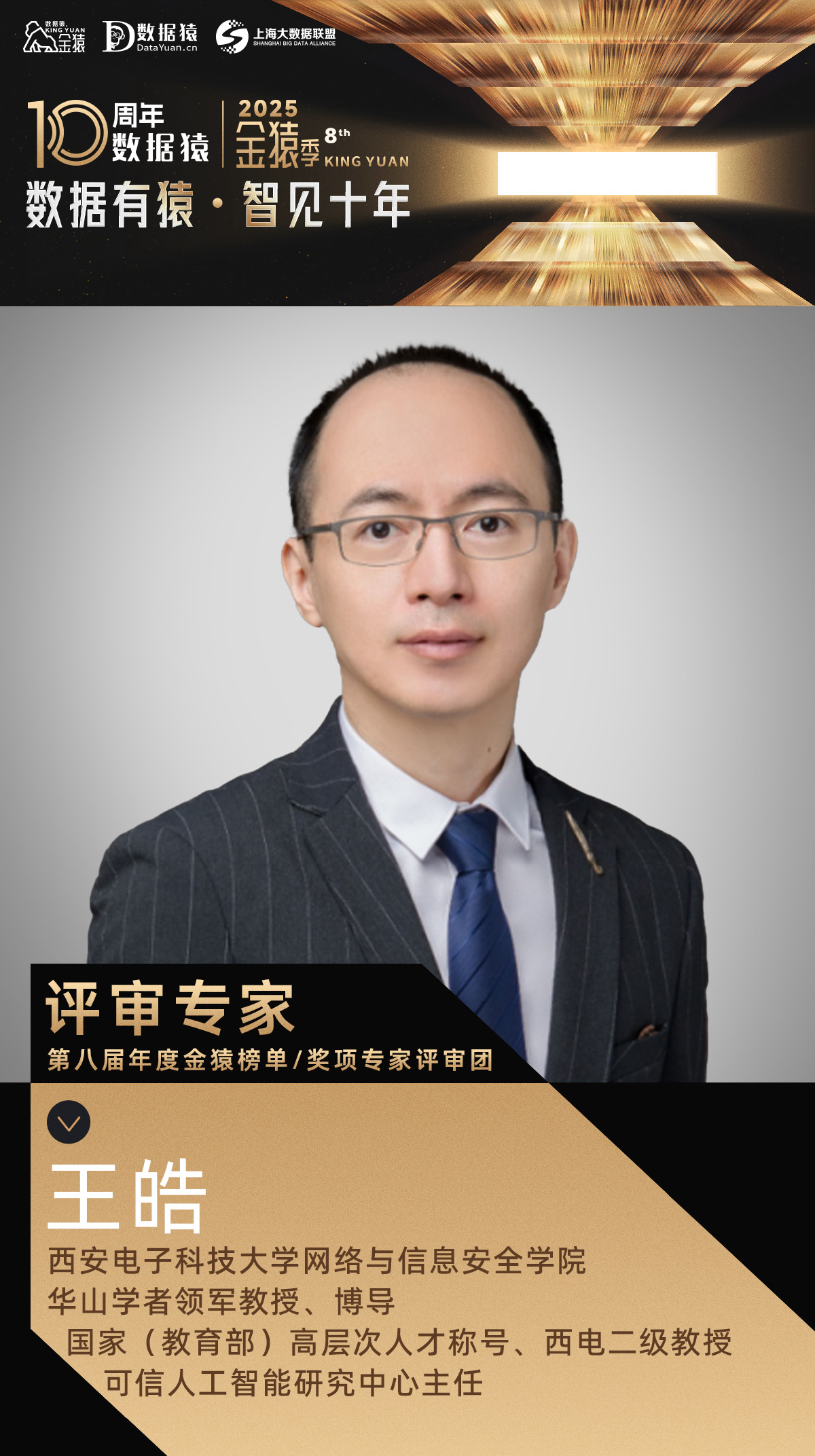 【终审团专家公告】西安电子科技大学二级教授王皓,已确认成为“2025第八届年度金猿”榜单/奖项评审团专家评委,并将授予评委荣誉证书。