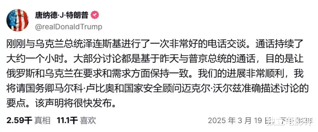 川普表示,他与泽连斯基进行了“非常好的”的通话