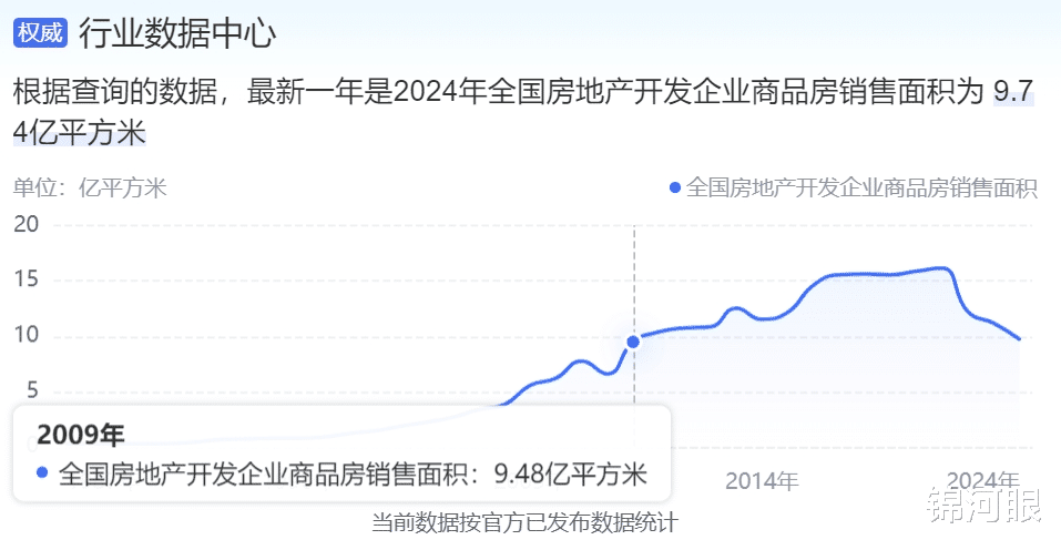从2021年下半年起,房地产已经在走下坡路了,以后这种趋势还会继续。2024年,我国商品房销售面积是9.7亿平米,销量已经跌到2009年左右的水平。