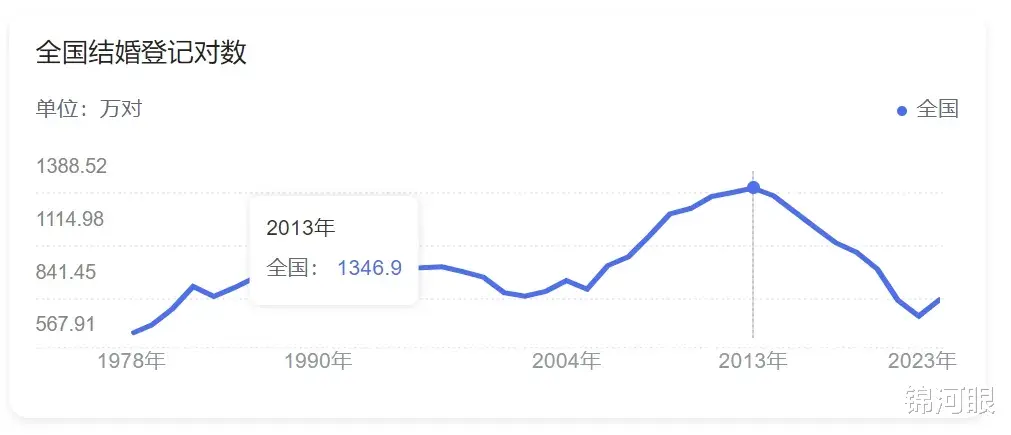 可以看到从1978年到2013年,结婚登记数总体成上升势头,从597.8万对猛增至1346.9万对,随后从2013年起就骤然下降,2022年降到683.5万的低点,随后2023年又有回升,接着2024年再陷入低谷。