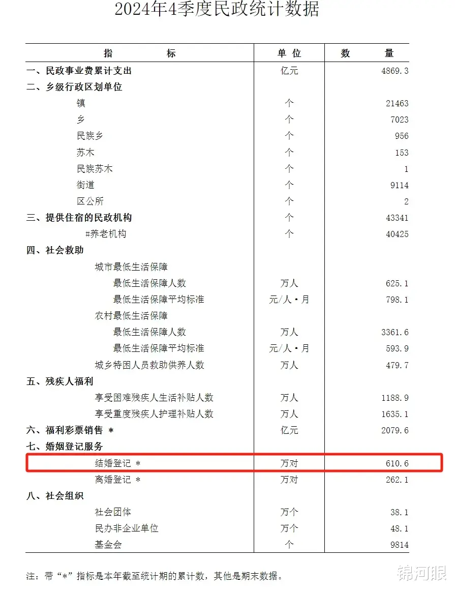 根据民政部官网发布的《2024年4季度民政统计数据》:
