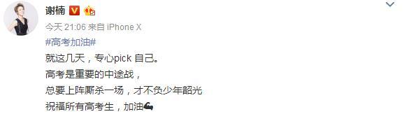 谢楠:高考加油,就这几天,专心pick 自己。高考是重要的中途战,总要上阵厮杀一场,才不负少年韶光