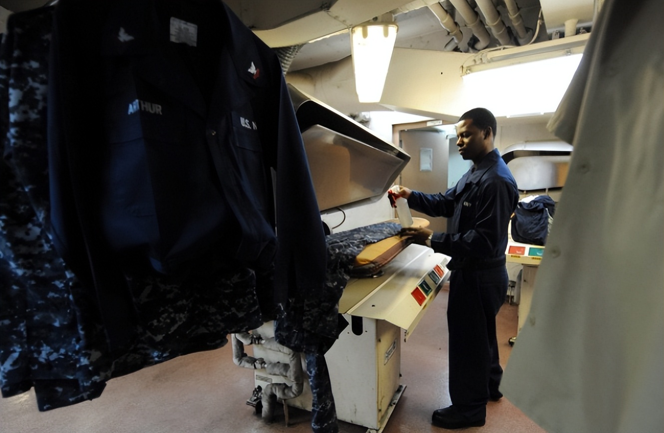而洗衣房作为舰上最核心的民生设施之一,承担着每天处理数千套衣物的重任——从水兵的制服、床上用品到洗漱毛巾,堆积如山的衣物需要依靠工业级洗衣设备24小时不间断处理,直接关系到官兵的日常生活质量和士气高低。