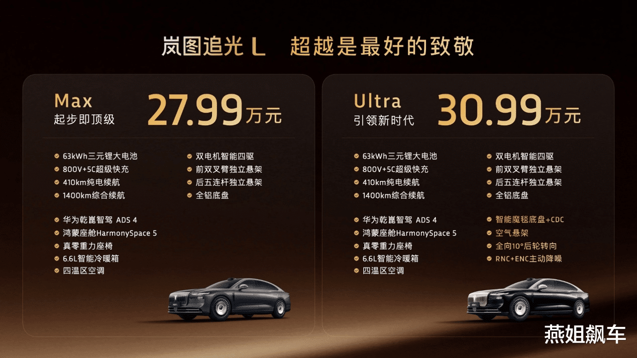 【2025年12月10日 北京】12月10日,新时代旗舰轿车——岚图追光L正式上市,共推出2款版型,售价分别为Max版27.99万元、Ultra版30.99万元。新车同步推出总价值5.2万元的终身免费三电质保、五年免费基础保养等首任车主六大无忧服务权益。