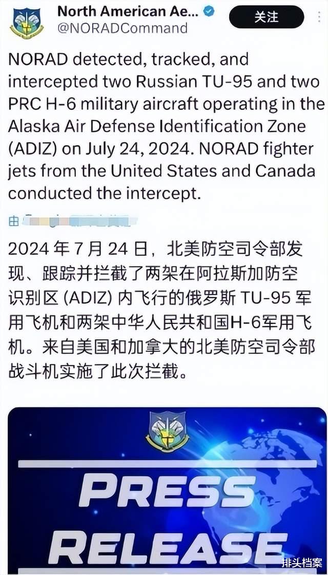 北美防空司令部在官方账号上突然发布消息称,在阿拉斯加防空识别区内发现并拦截了由2架中国轰-6轰炸机和2架俄罗斯图-95轰炸机组成的编队。对此,美国和加拿大的战斗机实施了紧急升空拦截。从轰炸机编队构成来看,这可能是已经连续开展多年的中俄轰炸机编队联合演训。
