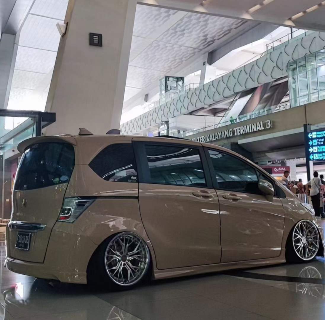 改装的关键在于 AIRBFT 气动避震。这套避震系统赋予了飞度一种令人惊艳的低趴姿态。当车身缓缓下降,飞度宛如一只蓄势待发的猎豹,在静止中蕴含着动感与力量。这种低趴风格不仅在视觉上给人强烈的冲击感,更在实际驾驶过程中优化了车辆的空气动力学性能,使车辆在高速行驶时更加稳定、流畅。