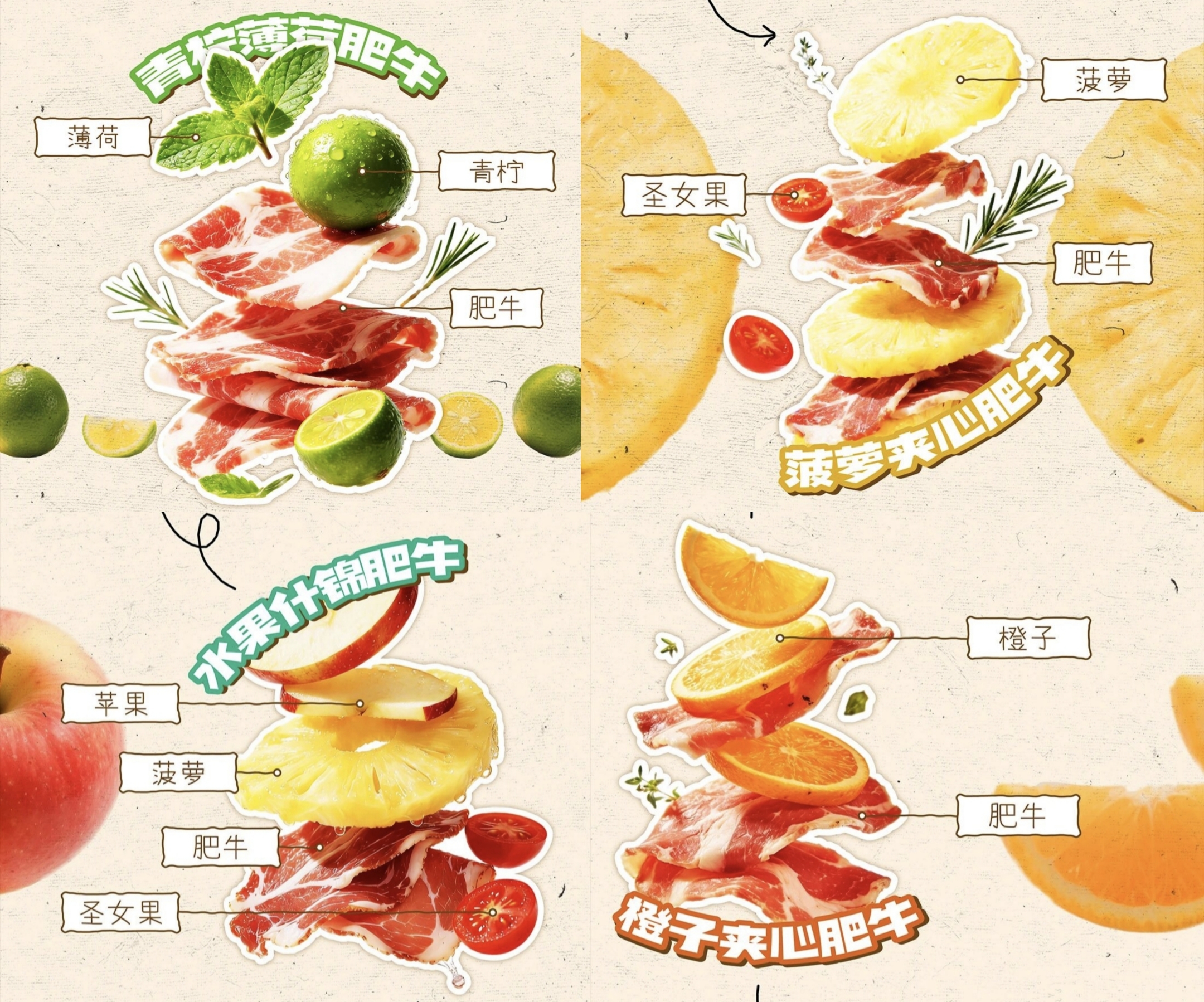 菠萝夹心肥牛以菠萝片为夹心,搭配圣女果点缀。菠萝特有的酸甜与酵素能够有效解腻,与肥牛的油脂形成鲜明对比;橙子夹心肥牛则主打清新果香,橙子的柑橘风味在烤制过程中释放,为肥牛增添一层清爽的果香底韵;水果什锦肥牛组合了苹果、菠萝、圣女果三种水果,通过多元水果的搭配,构建更丰富的口感层次;青柠薄荷肥牛则是本次上新中最具差异化的产品,青柠的酸爽与薄荷的清凉相结合,为肥牛带来独特的清新体验。