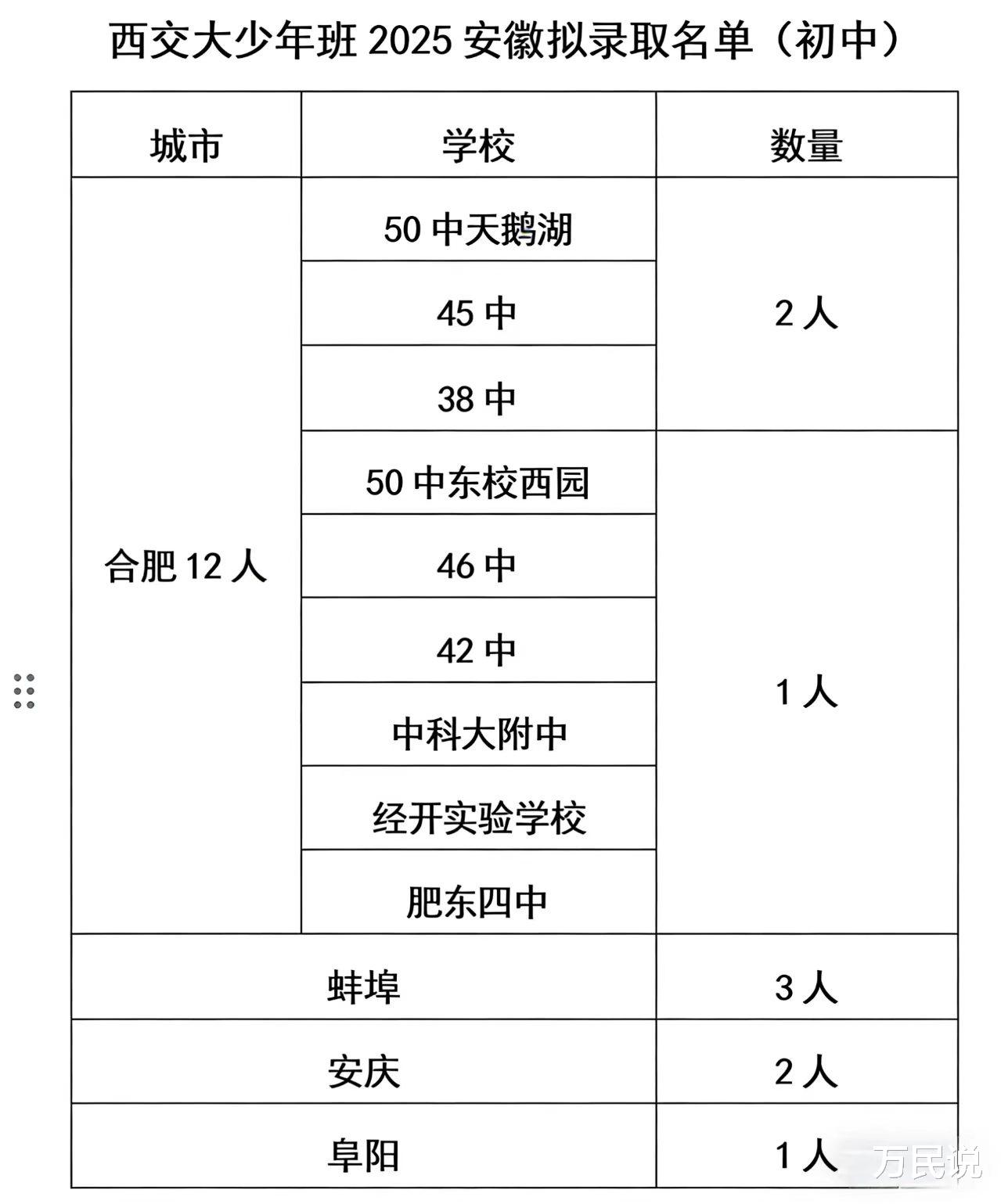 让我们把时间拉回到2025年。那一年,西交大面向初中应届毕业生的招生名额为130人,安徽拿下18席,占全国近七分之一。更值得关注的是,这18人中,合肥占了12席,相当于全国的近十分之一、安徽的三分之二。从巢湖之滨到天鹅湖畔,再到肥东县城,9所初中的12名学子交出了一份亮眼的成绩单:46中姜恩泽获得全国第三,50中天鹅湖校区黄景行拿下全国第六,尹同学位列全国第68;中科大附中王浩禹全国第19;肥东四中王浩澜以全国第69的成绩成功入围。45中、38中各贡献2人,42中、46中、50中西、经开实验等学校也各有斩获。
