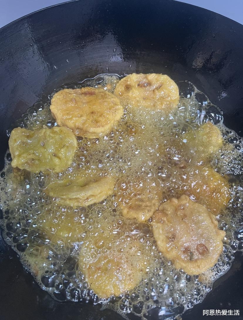 第五步:炸制(火候是灵魂),锅中倒入足量油,烧至六成热(约160℃,插入筷子周围会冒出密集小气泡)。将藕夹均匀裹上面糊,轻轻滑入油锅中。中火炸至表面微黄定型后捞出,大约2-3分钟。然后开大火将油温升至八成热(约180℃),将藕夹复炸30秒,这样能让外皮更加酥脆,还能逼出多余油脂。