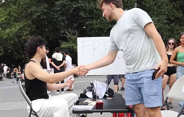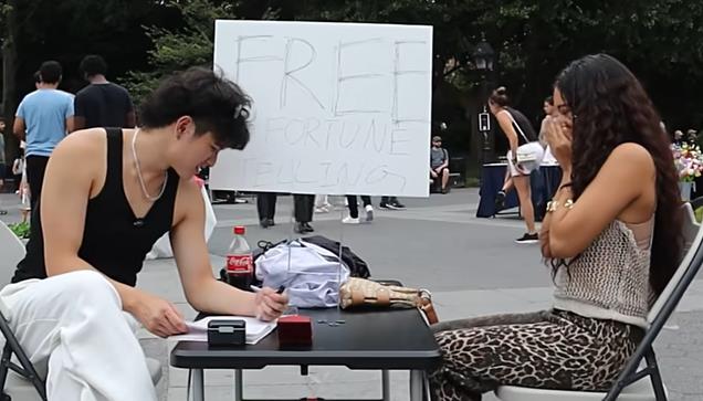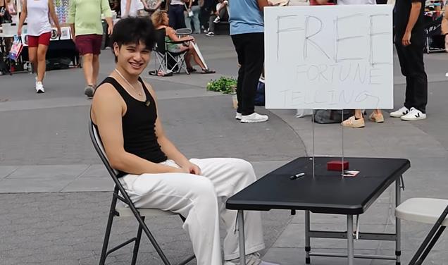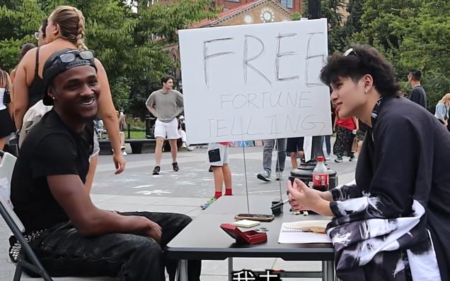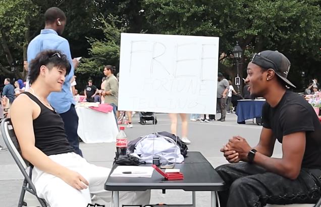 在这个视频中,小倪背了一张小桌板坐在美国的街头,身边摆了“免费算卦”的牌子,吸引了不少外国人前来算卦。