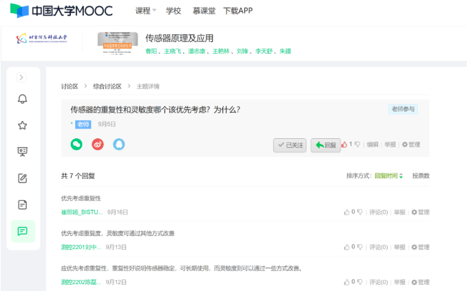 而仪器与光电工程学院的Office Hour主要采用线上交流方式,通过中国大学MOOC网,教师可以定期发布问题供学生思考,也可随时在线解答学生的疑问。且所有问答贴是全部师生可见,便于教师对学生的学习情况进行全面了解,也有助于同学之间互相带动、共同进步。