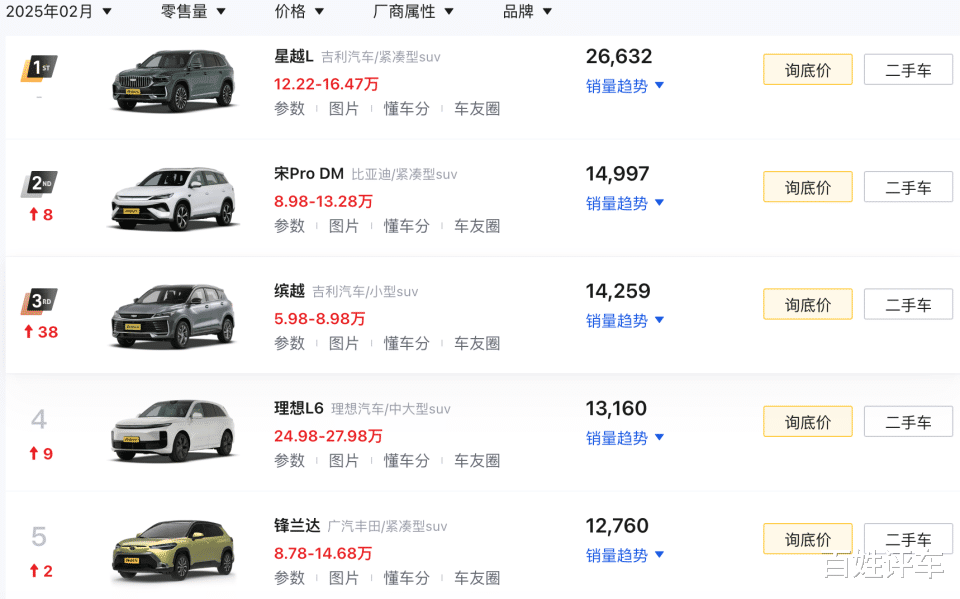 2025年2月,吉利星越L销量表现出色,展现强劲市场竞争力。中国汽车流通协会发布的销量数据显示,星越L凭借26632辆的销售成绩蝉联SUV市场销冠。另外,有数据表明2025年2月吉利星越L单月销量达2.3万辆,环比增长18%,登顶燃油SUV榜首。