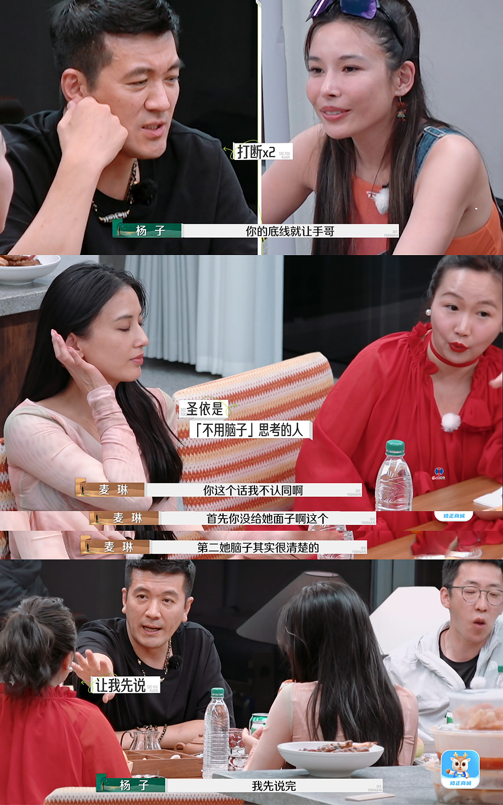 《再见爱人4》不管麦琳之前多讨人厌,但在节目的第八期麦琳是勇的,其他人都拿杨子没有办法,但麦琳克杨子是真的!在各自分开旅行又重聚的第一天晚上,刘爽和杨子“狼狈为奸”借题发挥,表面说着麦琳的问题,实际上都在点自己的老婆,葛夕和黄圣依并没有被洗脑,但每每想要反驳都会被杨子打断,只有麦琳成功打断杨子。在杨子说黄圣依傻时,麦琳立马反驳说自己不认同,之后接连输出,变成杨子尔康手:我先说完!