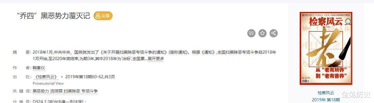 《检察风云》2019年第18期60-62页,详细记载了“乔四”黑恶势力的覆灭经过,全篇共3页,内容详实。