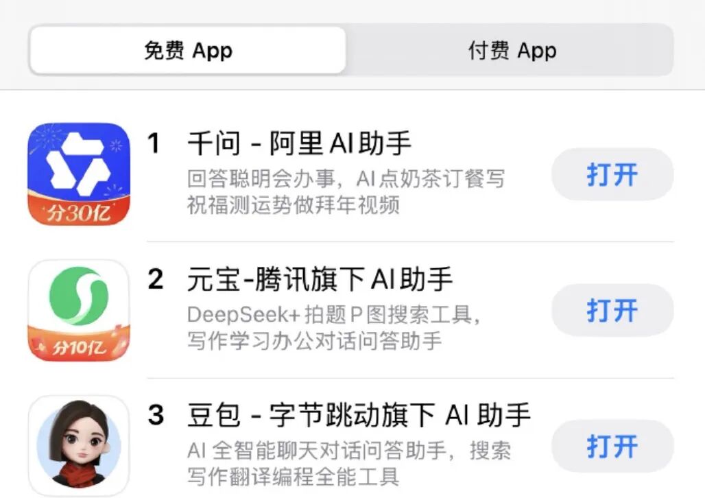 砸钱大战之下,豆包被挤到第三,DeepSeek 直接跌出前三,一批原本存在感就不强的国产 AI 应用,更是在这轮补贴大战里彻底边缘化。
