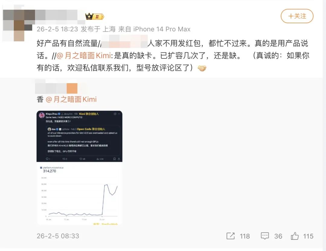2 月 5 日,Kimi 官方发微博称“是真的缺卡”,多次扩容仍无法满足需求,甚至公开在线求渠道。