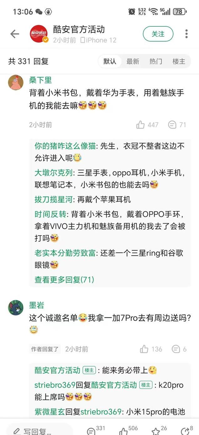 看到这里,大家应该明白为什么努比亚Z70 Ultra邀请上面两家用户前去参加品鉴会了吧?这就是对友商贴脸开大。网友果然也非常买账,有人表示要背着小米书包、带着华为手表、用着魅族手机去(一下得罪几家友商)。也有网友表示,不知道拿着一加7 Pro去能不能拿到周边,没想到有酷安官方回应能在务必带上,看来确实有惊喜。