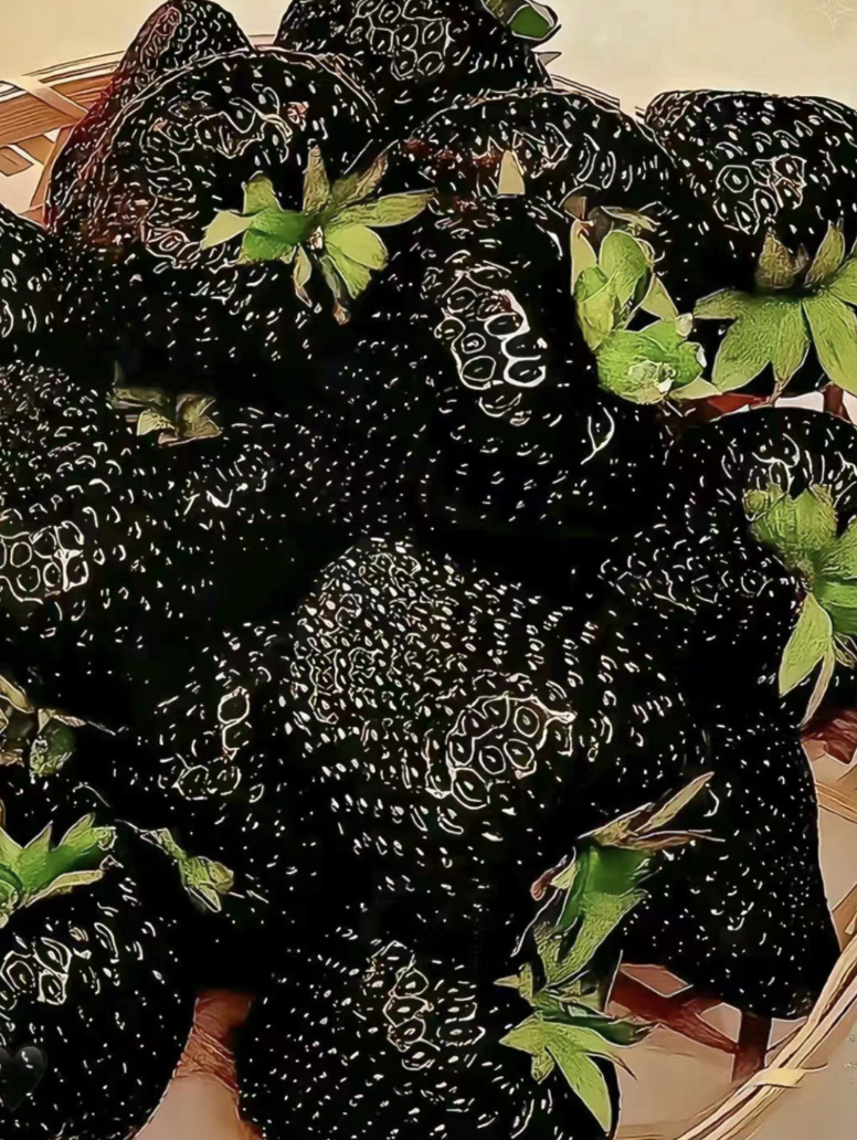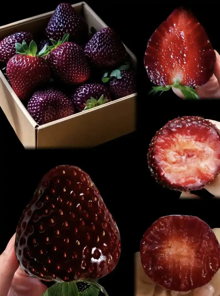 先看最直观的外观差异,一眼就能分清普通红草莓和黑草莓的区别。市面上10元左右一斤的普通草莓,多是红颜、章姬等常见品种,色泽鲜红透亮,果形圆润饱满,表皮布满细小的黄色果籽,摸起来手感偏软,成熟度高的果实甚至会微微发软渗水。而300元一斤的黑草莓,并非纯黑色,而是深黑红色近乎墨紫,果形更规整饱满,果面光滑有光泽,果籽颜色偏深,与果皮融为一体,手感偏硬实,即便完全成熟也不易变软,拿在手里分量更足,单颗大小也比普通红草莓更均匀,颜值直接拉满。