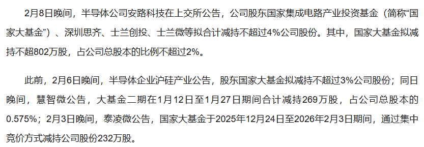 国家大基金一期早已进入回收期,正加速减持退出成熟领域。大基金二期目前已进入投退并举的阶段,在有序推进部分项目退出的同时,仍持续在半导体产业链的关键薄弱环节进行战略性布局。而大基金三期正全面开展投资,加速投向半导体设备、材料等核心环节,持续支持集成电路产业发展。高位的减一部分,低位还会再投一部分的,这几年一直是这样……