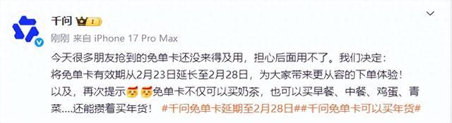 千问发文:今天很多朋友抢到的免单卡还没来得及用,担心后面用不了。我们决定:将免单卡有效期从2月23日延长至2月28日,为大家带来更从容的下单体验!