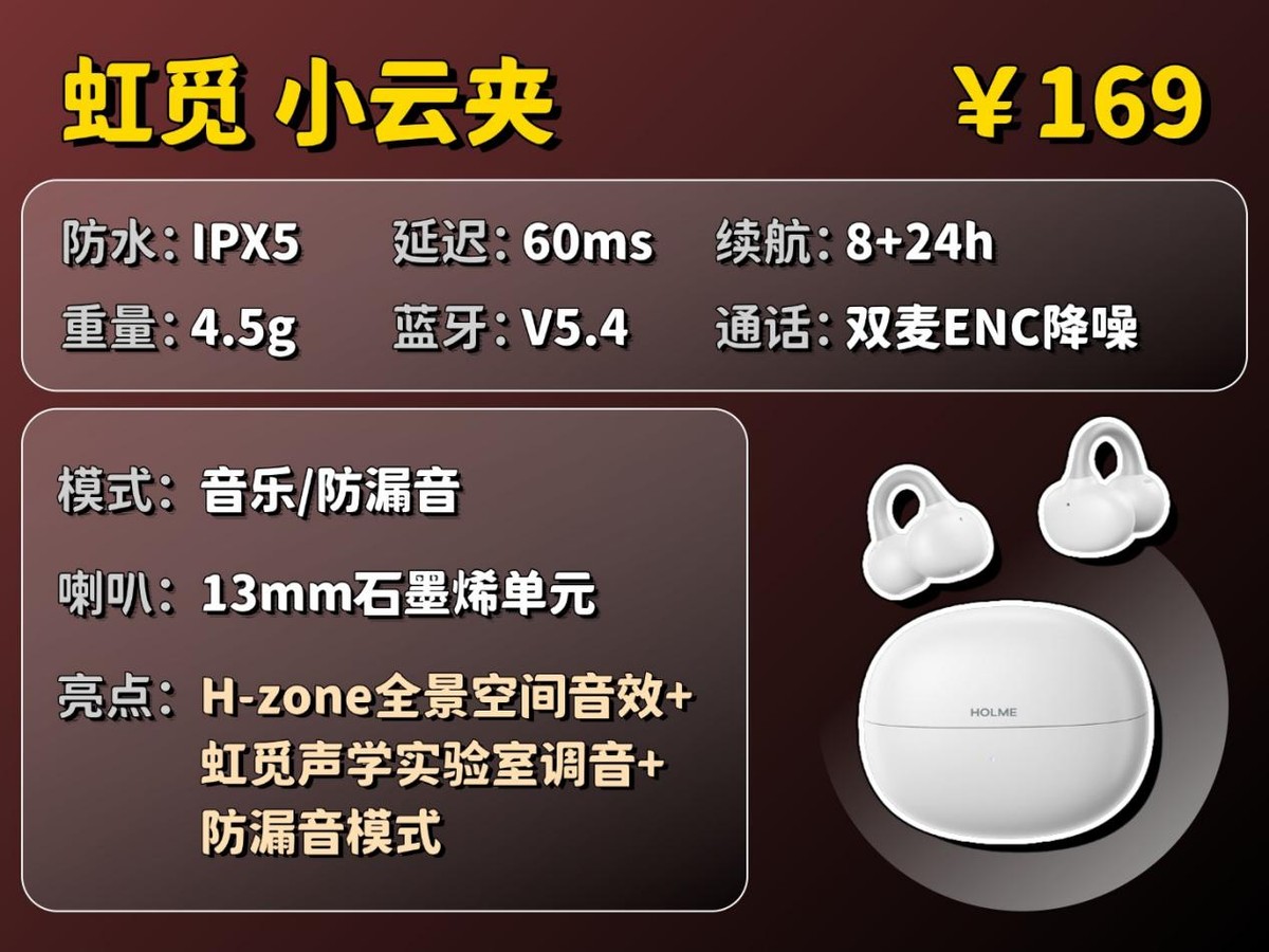 虹觅(HOLME):这是一个专注于开放式耳机的年轻品牌,每个产品都能感受到虹觅对消费者体验的用心,致力于为消费者提供真正高性价比的产品,是2023年的开放式耳机品质榜TOP3品牌。产品以技术创新为核心,如最新的虹觅Clip Pro在音质的体验更为用心。