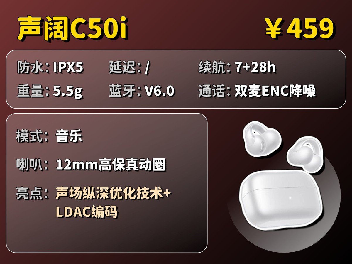 声阔 C50i 在音质表现上搭载了12mm高保真动圈,增强了声音的空间感和立体感,让听感更开阔且层次分明;其声场纵深优化技术进一步拉近了乐器与人声的距离,让声音变得更均衡;配合LDAC高清传输,能保留丰富的音乐细节,整体声音饱满而均衡。