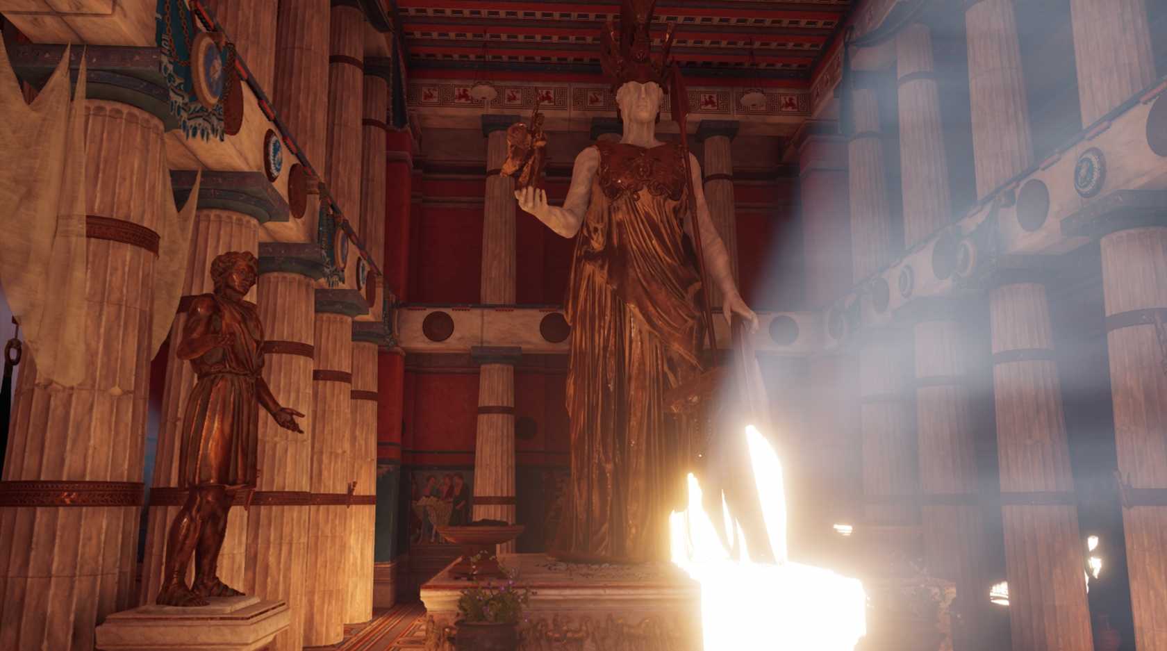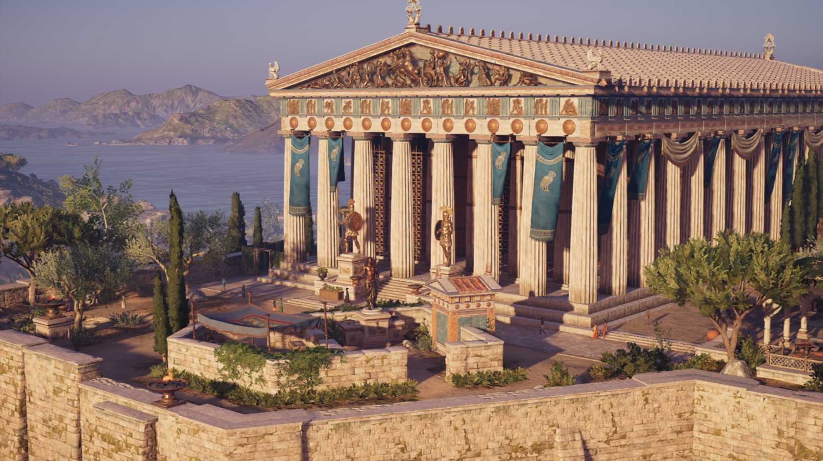 神庙以黄金比例和视觉矫正技术闻名,如柱子微凸、地基略曲以增强视觉效果。46根大理石柱以精妙的排列,使建筑在视觉上更显挺拔。游戏中的光影效果完美还原了这些立柱的质感,尤其在日落时分,金色的阳光洒在柱廊上,恍若神迹。